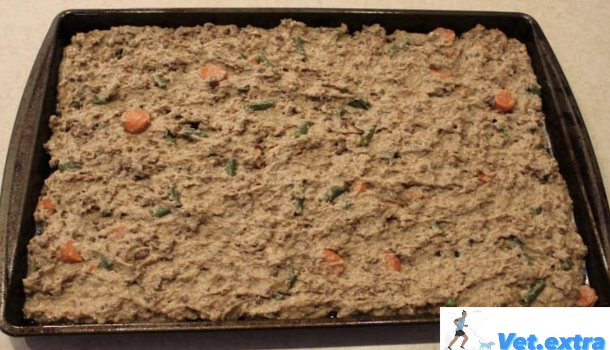 مخلوط خمیر را روی یک ورقه کوکی خیلی خوب چرب شده پهن کنید. ضخامت آن باید حدود 1/2 اینچ باشد. این دستور غذای خشک خانگی سگ را در دمای 200 درجه به مدت 30 دقیقه بپزید.