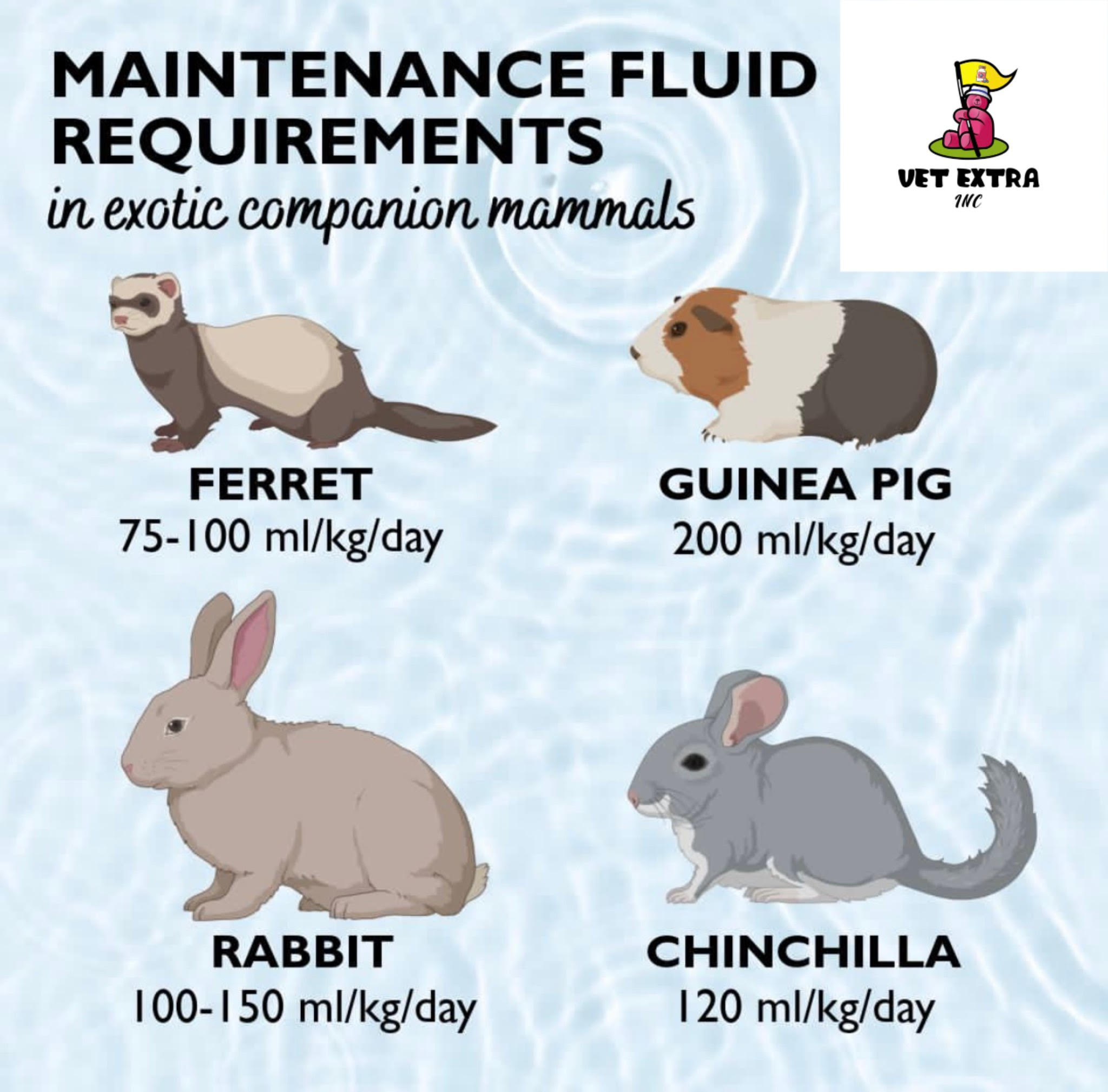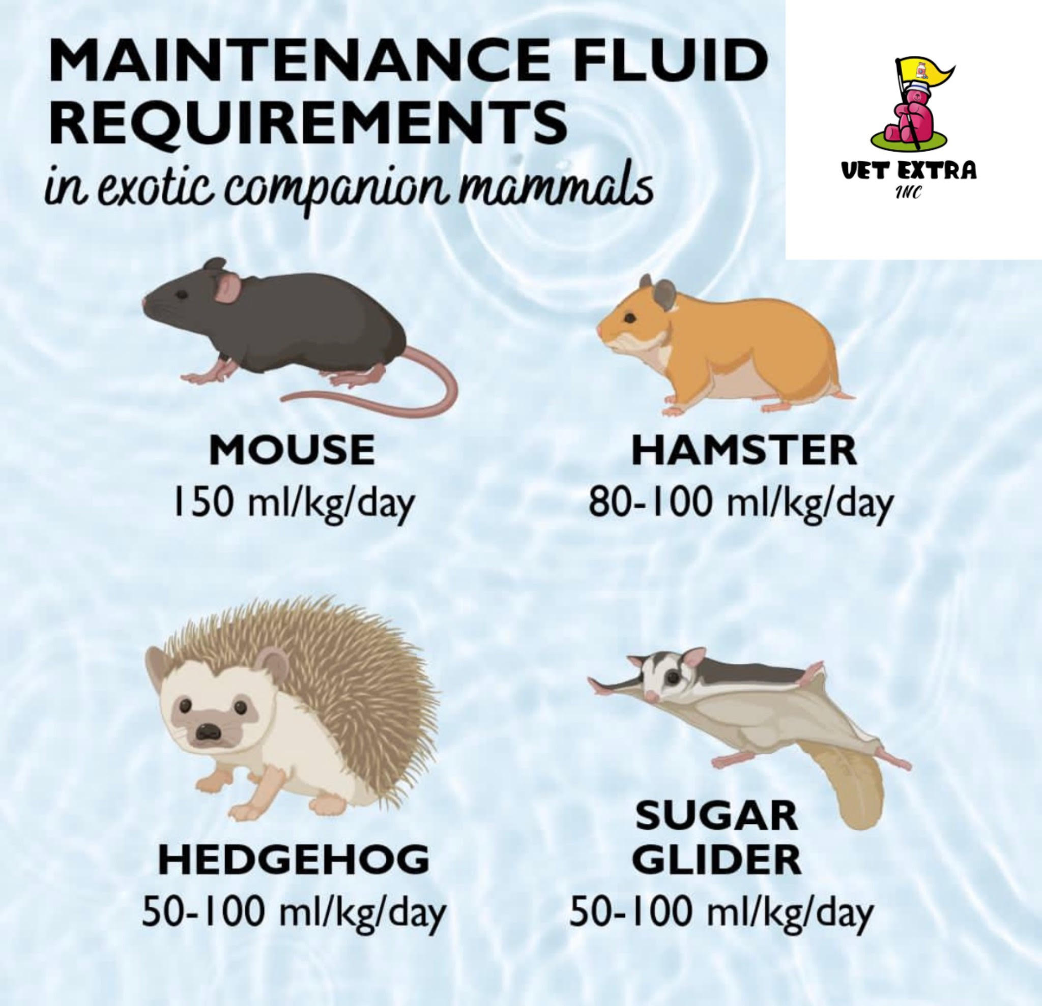 به دلیل جثه کوچک و متابولیسم بالا، نیاز روزانه پستانداران کوچک به مایع در مقایسه با سگ و گربه نسبتاً زیاد است. کم آبی بدن و شوک می تواند به راحتی به دنبال کاهش مصرف غذا یا آب در بیماران بستری در بیمارستان رخ دهد